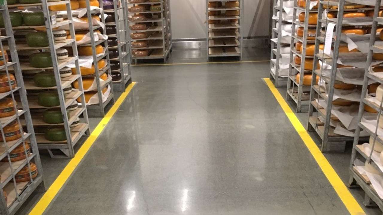 In de zuivelindustrie worden onder andere melk, boter en kaas geproduceerd. Het is belangrijk dat de vloer tegen bacteriën kan.